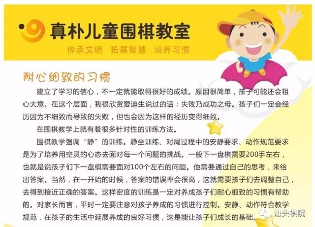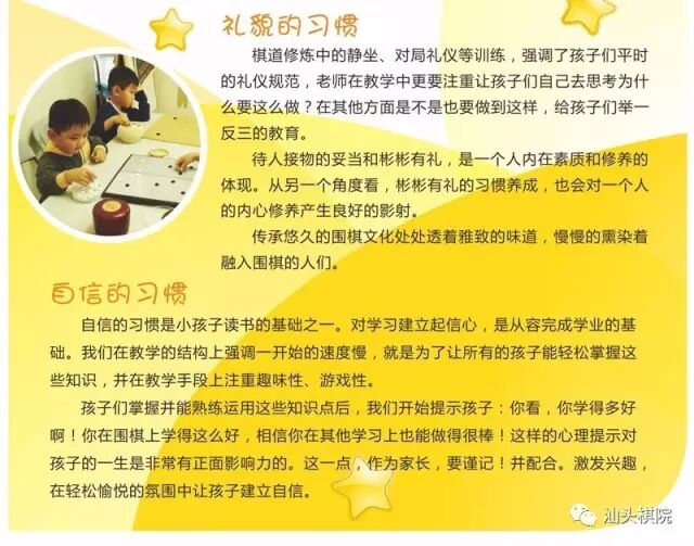 在教学上,往往速度不予过快,为了让孩子轻松掌握知识,并在教学上注重趣味性、游戏性!当孩子熟练运用这些知识后,我们开始提示孩子:你在围棋上学习得这么好,相信你在其他方面也能做得很棒!这样的心理提示,对孩子是非常有正面影响力的,做为家长,要谨记!要配合!